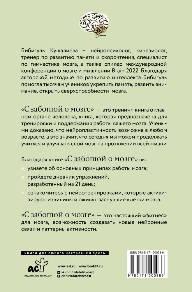 «С заботой о мозге» — это тренинг-книга о главном органе человека, книга, которая предназначена для тренировки и поддержания работы вашего мозга. Учеными доказано, что нейропластичность возможна в любом возрасте, а это значит, что мы можем продолжать учиться и улучшать свой мозг на протяжении всей жизни.