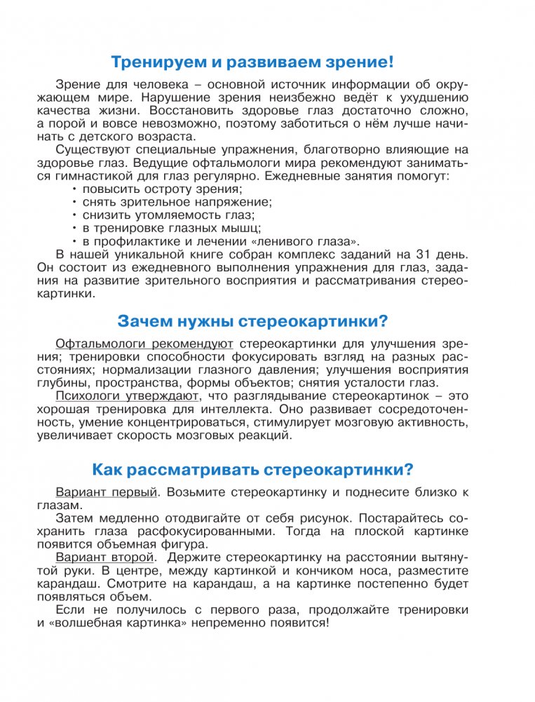 Книга исключительно практическая, состоит из стереокартинок и упражнений на каждый день. Всего за месяц тренировок вместе с ребёнком вы получите заметный результат.