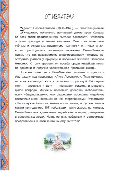 Знаменитый канадский писатель Эрнест Сетон-Томпсон всю свою жизнь посвятил изучению дикой природы. Другим его увлечением были индейцы, их «лесная наука». Индейцы щедро делились с писателем секретами и сказками, которые поведали им леса Северной Америки, и в результате на свет появилась эта книга удивительных историй.