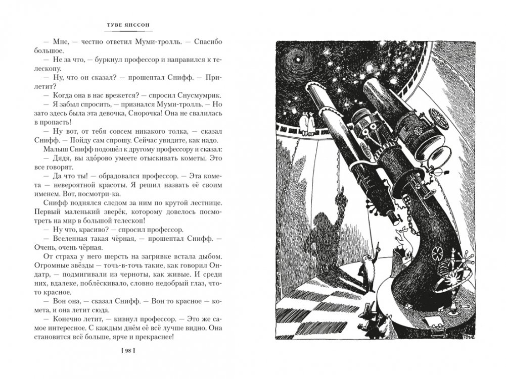 В маленькой долине на зелёном лугу стоит удивительный дом, выкрашенный голубой краской. В этом доме живёт семейство муми-троллей: Муми-мама, Муми-папа и сам Муми-тролль. И если в один прекрасный день на пороге объявится большая компания, здесь всем найдётся место. Вообще-то, вокруг много всего непонятного и опасного — стихийные бедствия, волшебные шляпы, муравьиные львы… Но муми-троллей, снорков, Сниффа, Снусмумрика и их друзей это вовсе не пугает. Они путешествуют, размышляют о нужности и ненужности всего сущего, пишут книги и ищут сокровища. Ведь какие бы приключения ни ожидали Муми-тролля и его друзей, они знают: даже если в их долину упадёт комета, даже если случится наводнение или начнётся буря, лес, сад и дом останутся на месте. На веранде всегда можно будет выпить чашечку кофе и полакомиться печеньем или тортом, который испекла Муми-мама… Папа с мамой всё уладят, только нужно вовремя вернуться домой!..