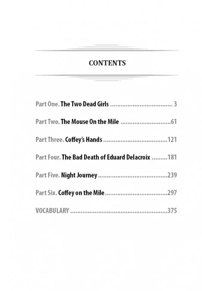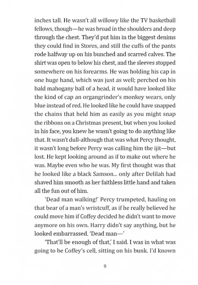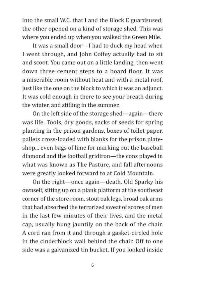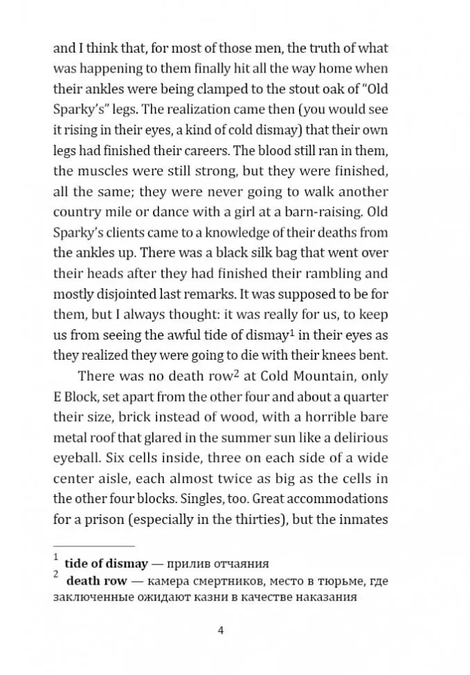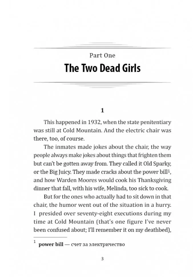 Те, кто прошел "зеленую милю" тюрьмы "Холодная гора", не возвращаются, потому что в конце этого пути стоит электрический стул, и пройти этот путь можно только в одну сторону… Трудно какому бы то ни было произведению сравниться с этим неоднозначным, уникальным, пронзительным романом. Это история с чудесными и отвратительными героями, с невероятным в своей несправедливости сюжетом. История, наполненная отчаянием и болью тех, кто находится на пороге смерти. И несмотря ни на что, это история о Чуде, наполненная любовью и надеждой.
