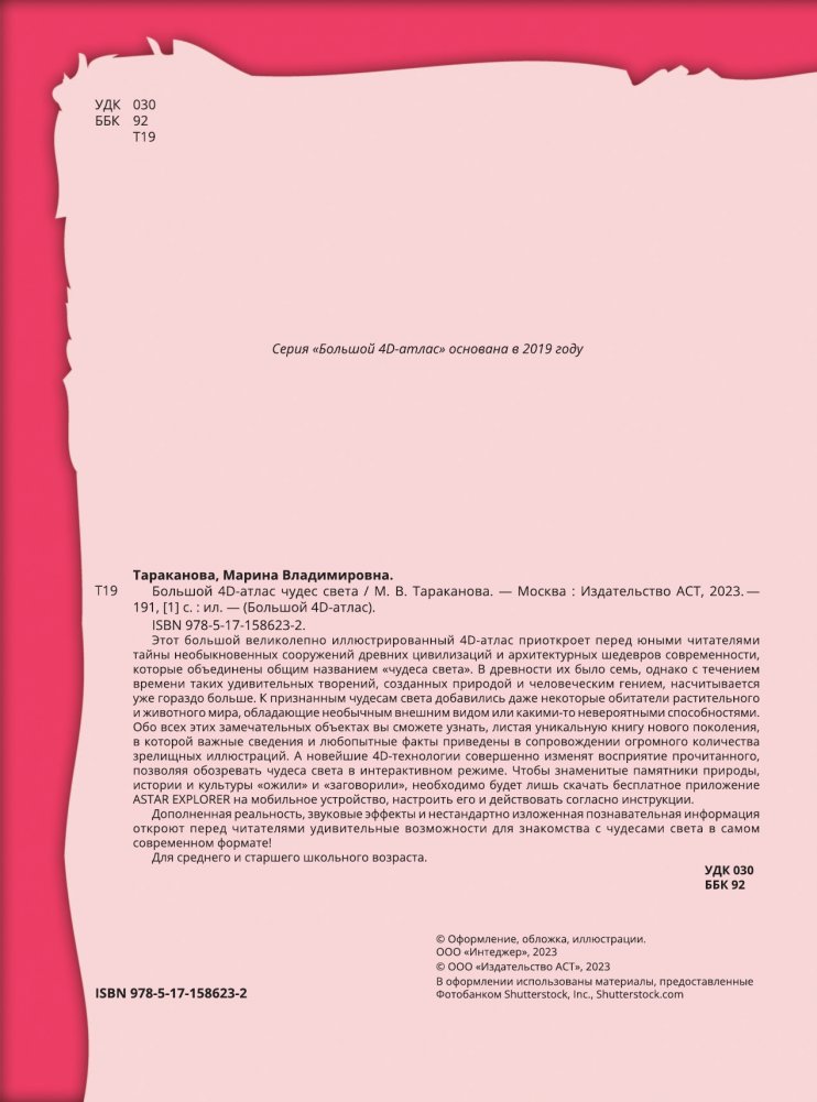 Этот большой великолепно иллюстрированный 4D-атлас приоткроет перед юными читателями тайны необыкновенных сооружений древних цивилизаций и архитектурных шедевров современности, которыеобъединены общим названием "чудеса света". В древности их было семь, однако с течением времени таких удивительных творений, созданных природой и человеческим гением, насчитывается ужегораздо больше. К признанным чудесам света добавились даже некоторые обитатели растительного иживотного мира, обладающие необычным внешним видом или какими-то невероятными способностями. Обо всех этих замечательных объектах вы сможете узнать, листая уникальную книгу нового поколения, в которой важные сведения и любопытные факты приведены в сопровождении огромного количества зрелищных иллюстраций. А новейшие 4D-технологии совершенно изменят восприятие прочитанного, позволяя обозревать чудеса света в интерактивном режиме. Чтобы знаменитые памятники природы, истории и культуры "ожили" и "заговорили", необходимо будет лишь скачать бесплатное приложение ASTAR EXPLORER на мобильное устройство, настроить его и действовать согласно инструкции. Дополненная реальность, звуковые эффекты и нестандартно изложенная познавательная информация откроют перед читателями удивительные возможности для знакомства с чудесами света в самом современном формате!