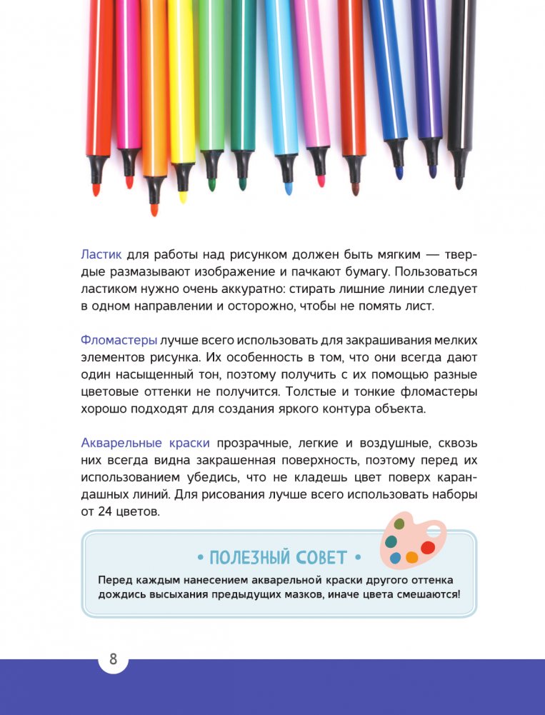 Благодаря тому, что в качестве наглядных примеров используется очень широкий спектр объектов, объединенных в тематические разделы, издание будет интересно и мальчикам, и девочкам. Кроме того, юные художники узнают много интересного об окружающем мире, ведь каждая картинка сопровождается удивительными фактами о животных, растениях, технике и многом другом.