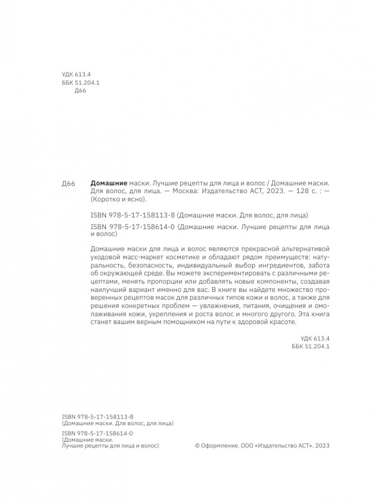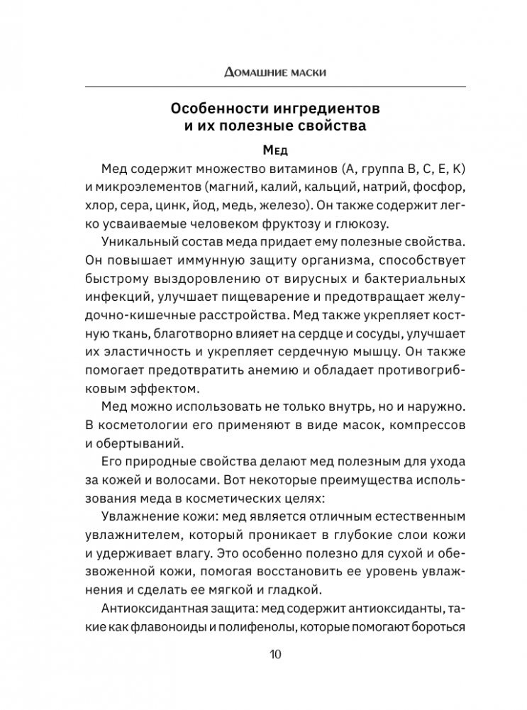 Домашние маски для лица и волос являются прекрасной альтернативой уходовой масс-маркет косметике и обладают рядом преимуществ: натуральность, безопасность, индивидуальный выбор ингредиентов, забота об окружающей среде. Вы можете экспериментировать с различными рецептами, менять пропорции или добавлять новые компоненты, создавая наилучший вариант именно для вас. В книге вы найдете множество проверенных рецептов масок для различных типов кожи и волос, а также для решения конкретных проблем — увлажнения, питания, очищения и омолаживания кожи, укрепления и роста волос и многого другого. Эта книга станет вашим верным помощником на пути к здоровой красоте.