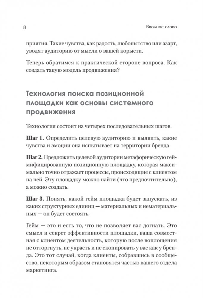 В книге представлена авторская модель системного продвижения, которая показывает, что раскручивать бренд можно одновременно и эффективно, и малобюджетно. В основу методики заложены поиск и создание позиционной площадки, что позволит включить клиента в игру и добиться его лояльности.