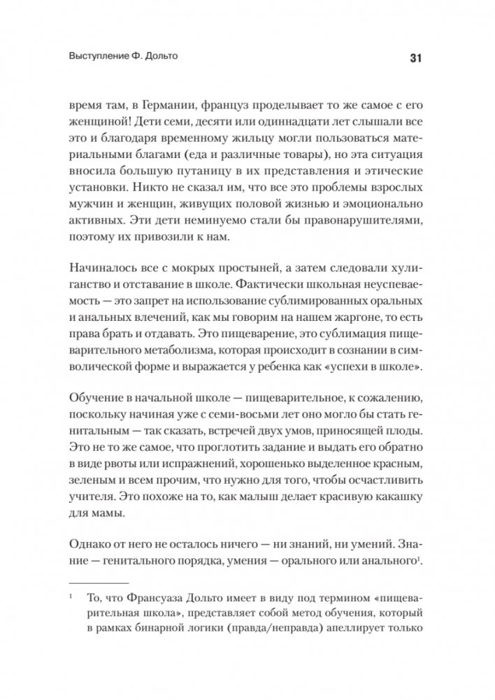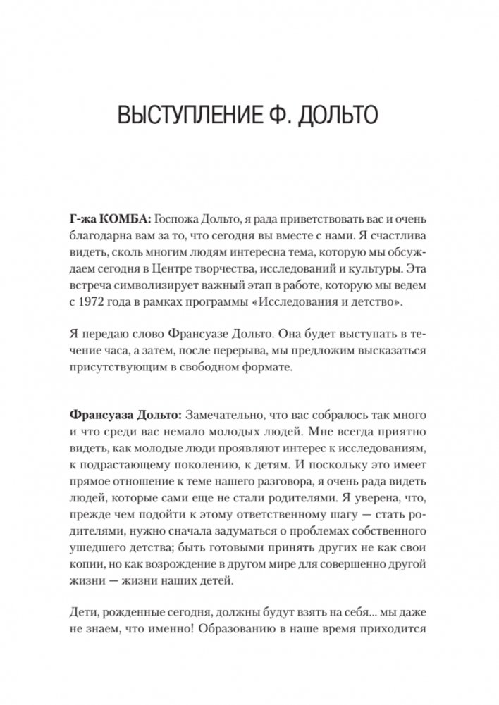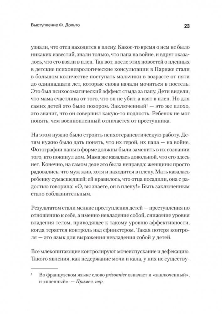 В этой книге, составленной по материалам одной из психоаналитических конференций с участием Дольто, описываются все нюансы языка, которым взрослые общаются с детьми, а дети с взрослыми. Что бы ребенок ни делал, по сути, это его слова, которые через его действия нужно услышать, причем буквально. Таким образом можно узнать о чувствах, которые ребенок не может сформулировать и вербализировать, чувствах, которые возникают у него, когда он сталкивается с ложью, недоговариванием и избегающим молчанием взрослых. Дольто описывает и интерпретирует язык детей, чтобы родители умели распознавать страдание ребенка и находить нужные слова, способные избавить его от "ненужной боли".