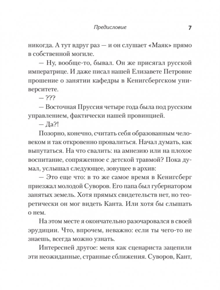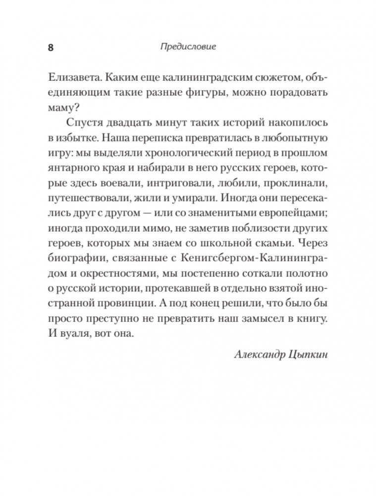 Перед вами не очередная краеведческая книга о Калининградской области. Это литературный мини-сериал о том, как в отдельно взятой иностранной провинции протекала большая история России. Петр Великий приезжает сюда инкогнито, чтобы вести кулуарные переговоры с прусским герцогом и учиться артиллерийским наукам, Суворов вступает в масонскую ложу, Григорий Орлов конвоирует пленного адъютанта Фридриха Второго, Багратион, Барклай и Денис Давыдов бьются с войсками Наполеона, Достоевский скорбит о неразделенной любви, Ленин обдумывает создание революционной организации, а Твардовский завершает «Василия Теркина».