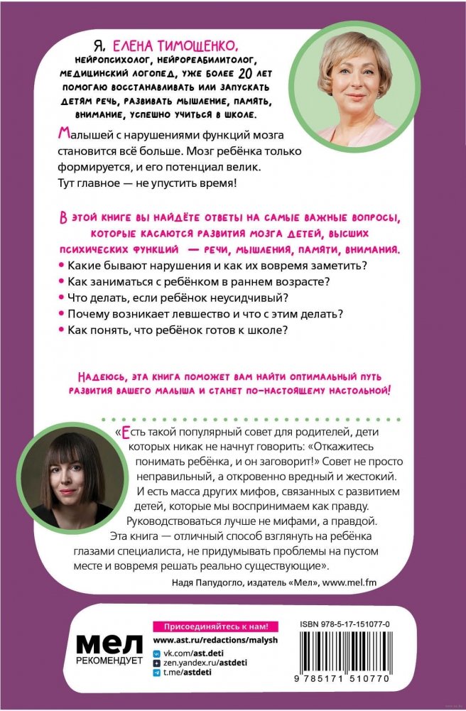 В этой книге заботливые родители найдут ответы на самые важные вопросы, которые касаются особенностей развития мозга, высших психических функций ребенка - речи, мышления, памяти, внимания. Какие бывают нарушения и как их вовремя заметить? Как заниматься с ребенком в раннем возрасте? Что делать, если ребенок неусидчивый? Почему возникает левшество и что с этим делать? Как понять, что ребенок готов к школе? Здесь нет места мифам и псевдоисследованиям! Вся информация из проверенного источника. Автор книги нейропсихолог, нейрореабилитолог, медицинский логопед Елена Тимощенко - специалист экстра-класса с огромным опытом работы.