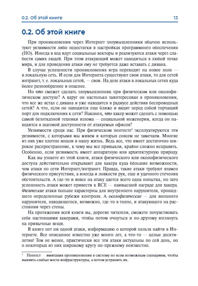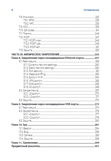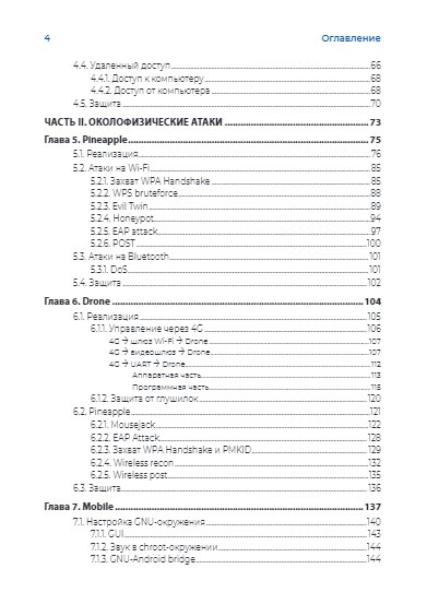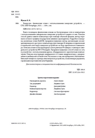 Книга посвящена физическим атакам на беспроводные сети и компьютеры с использованием самодельных хакерских устройств и защите от них. Показан способ дампа памяти компьютера при помощи обычной флешки, метод перехвата сетевого трафика посредством зажимов-«крокодилов». Подробно освещены различные атаки BadUSB, продемонстрирован метод организации несанкционированного доступа к компьютеру при помощи 4G-модема и подключения к локальной сети через хакерское устройство на базе одноплатного компьютера. Описаны атаки на беспроводные сети и уличные IP-камеры с помощью самодельного устройства Wi-Fi Pineapple. Продемонстрирован способ атаки на сеть и устройства с использованием дрона, оборудованного одноплатным компьютером. Описана конструкция защищенного от помех квадрокоптера с управлением по мобильной сотовой сети. Рассказано о том, как превратить обычный мобильный телефон в «трекер» или хакерское устройство, позволяющее управлять гаражными воротами или шлагбаумами.