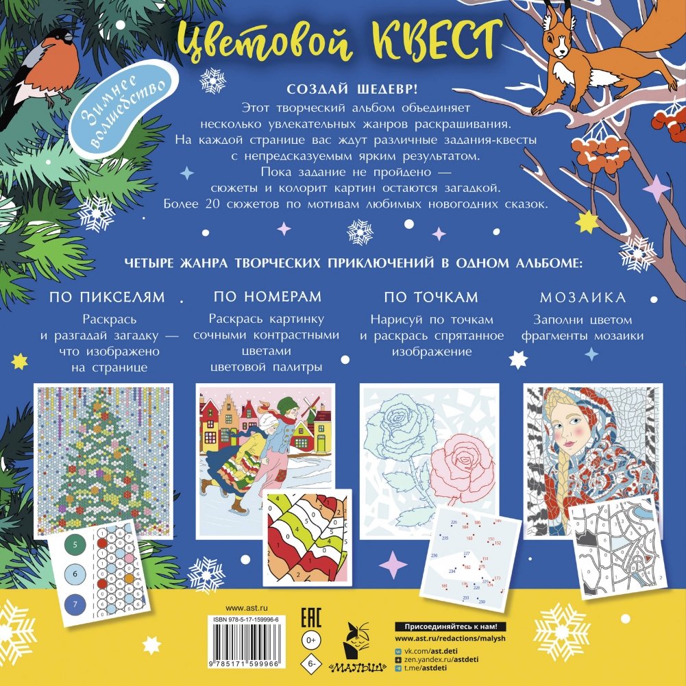 Этот творческий альбом объединяет несколько увлекательных жанров раскрашивания. На каждой странице вас ждут различные задания-квесты с непредсказуемым ярким результатом. Пока задание не пройдено - сюжеты и колорит картин остаются загадкой.
