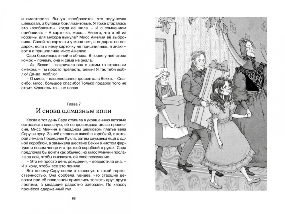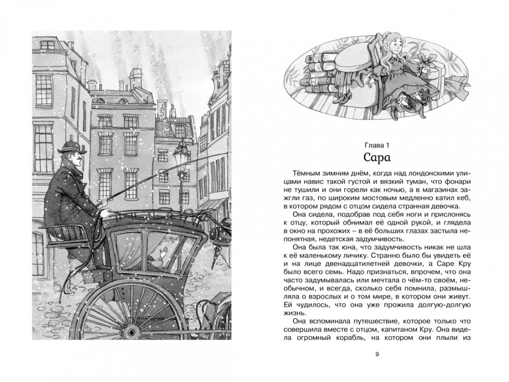 В 1905 году детская писательница Фрэнсис Бёрнетт (1849–1924) написала удивительную историю о необычной девочке Саре Кру. Сара родилась в Индии, стране невиданных богатств и волшебства. Она жила, как настоящая принцесса, в роскоши, окруженная заботой и любовью. И, как полагается принцессе, даже в самые тёмные времена Сара сохранила доброе сердце и веру в чудеса, которые помогали ей отважно переносить все невзгоды. Чистая, светлая душа девочки, умение любить и сострадать сотворили настоящее волшебство и изменили жизнь Сары к лучшему.