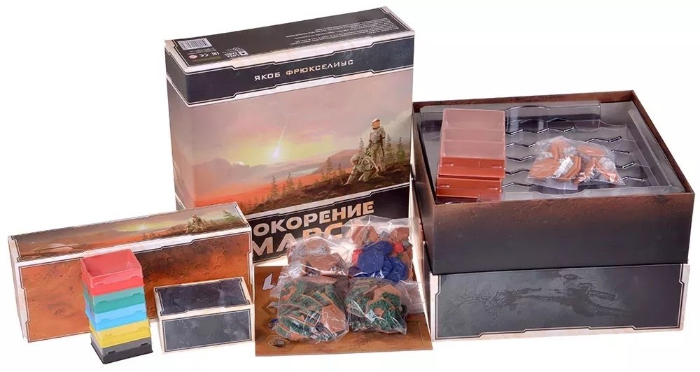 Для чего она нужна? Основное её предназначение – удобное хранения базовой игры и всех дополнений "Покорения Марса": с этим "биг боксом" можно забыть про разрозненное хранение компонентов во множестве коробок, теперь всё будет в одном месте. А это, между прочим, немаловажный плюс, поскольку подготовка к партии и сбор компонентов после игры будут происходить гораздо быстрее! Ещё в этот Big Box входят более 90 объёмных составных маркеров и жетонов, которые заменяют собой плоские картонные жетоны. Теперь процесс озеленения Марса визуализирован ещё более подробно и ярко! Настоящая услада для глаз.