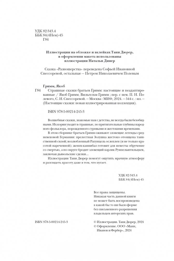 В этом сборнике братьев Гримм оживают зловещие легенды средневековой Германии: прелестная Золушка жестоко отомщена таинственной силой; возлюбленный Рапунцель ослеплен (и не только красотой нареченной); жених-каннибал готовит для невесты обручение со смертью, а по округе бродит зловещий карлик Румпельштильцхен, заключая дьявольские сделки…