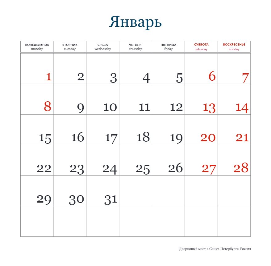 Благодаря большому формату и высокому качеству изображений этот календарь может стать отличным дополнением интерьера. В нем также отмечены выходные дни, а просторная сетка позволяет удобно планировать время и записывать важные события.