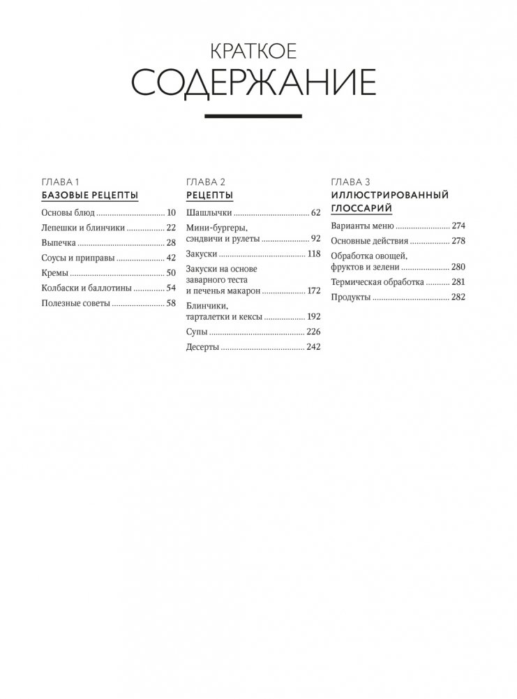 В глоссарии содержатся варианты меню для фуршета — от аперитива до обеденного и вечернего, иллюстрируются основные приемы и этапы приготовления, особенности очистки, нарезки, шинковки продуктов, термической обработки и сопутствующих процессов. Рецепты, советы и идеи, изложенные в этой книге, помогут вам сделать праздничный прием гостей ярким и незабываемым!