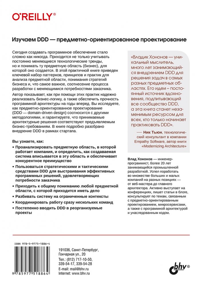 Книга посвящена методологии DDD (предметно-ориентированному проектированию), что особенно актуально в условиях дробления предметных областей и усложнения бизнес-взаимодействий. Рассказано, как оценить масштаб и сложность предметной области, измерить темпы её развития, учесть необходимые зависимости, применять событийно-ориентированную архитектуру и структурировать создаваемое ПО, эффективно вписывая его в сеть данных (Data Mesh). Материал будет особенно интересен при развитии стартапа и разработке наукоёмких отраслевых систем.