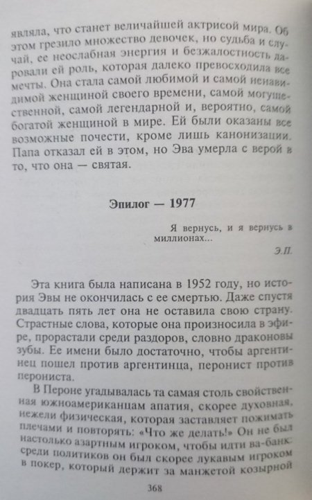 Данная книга биографическая и повествует о жизни Эвиты (настоящее имя Эва Дуарте де Перон) - звезды эфира, жены аргентинского президента, диктатора Хуано Доминго Перона, "защитницы угнетенных" и "великой благодетельницы", кровожадной и жестокой властительницы. Судьба и амбиции вознесли ее на вершину власти. Заполучив в свои руки миллиардное состояние, она поставила себе цель - отомстить высшему обществу за свое голодное, полное унижений детство.