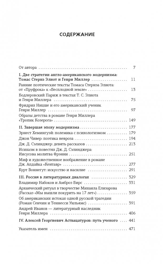 Имя Андрея Аствацатурова, литературоведа, профессора СПбГУ, хорошо известно не только в профессиональной филологической среде: он автор книг и статей об англо-американской литературе, романов «Люди в голом», «Скунскамера», «Осень в карманах», «Не кормите и не трогайте пеликанов». В новой книге Андрей Аствацатуров обращается к творчеству классиков ХХ века, а также современных русских писателей. Сочетание серьезной проблематики и увлекательной манеры изложения, благодаря которому Аствацатуров известен как блестящий лектор, присутствует и в его литературоведческих работах. Виртуозный анализ позволяет увидеть парадоксы, казалось бы, в хрестоматийных произведениях англо-американских модернистов — Генри Миллера, Эрнеста Хемингуэя, Джерома Дэвида Сэлинджера, Курта Воннегута, Джона Апдайка. А современные русские авторы самым неожиданным образом оказываются их наследниками: в уголовном рассказе Романа Сенчина проступает сюжет «Трамвая „Желание“» Теннесси Уильямса, а летописец русского зарубежья Андрей Иванов предстает русским Генри Миллером. Книга адресована широкому кругу читателей — и филологам, и тем, кто хотел бы лучше понимать произведения мировой классики, познакомиться с самыми яркими именами современной русской литературы и ощутить прихотливую логику литературного процесса.