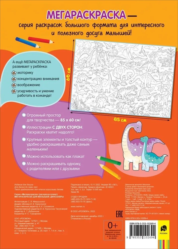МЕГАРАСКРАСКА — серия раскрасок большого формата для интересного и полезного досуга малышей! Огромный простор для творчества — 85*60см! Иллюстрации с двух сторон. Раскраски хватит надолго! Крупные элементы и толстый контур — удобно раскрашивать даже самым маленьким! Можно использовать как плакат. Можно раскрашивать одному, с родителями или с друзьями. А еще МЕГАРАСКРАСКА развивает у ребенка: моторику, концентрацию внимания, воображение, усидчивость и умение работать в команде!