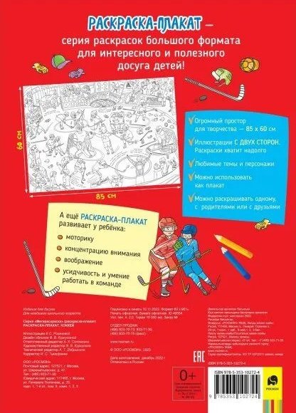 РАСКРАСКА-ПЛАКАТ хоккей — серия раскрасок большого формата для интересного и полезного досуга детей! Огромный простор для творчества юному хоккеисту — 85 х 60 см! Иллюстрации С ДВУХ СТОРОН. Раскраски хватит надолго! Любимые темы и персонажи. Можно использовать как плакат. Можно раскрашивать одному, с родителями или с друзьями. А ещё РАСКРАСКА-ПЛАКАТ развивает у ребёнка: моторику, концентрацию внимания, воображение, усидчивость и умение работать в команде! Раскраска ХОККЕЙ - отличный подарок хоккеисту ребенку , нападающему , вратарю , защитнику , тренеру , команде , сыну , мужу , брату .