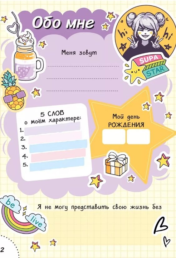 Раскрой свою уникальную индивидуальность на страницах этого стильного дневника! Интересные вопросы, тесты и задания помогут тебе больше узнать о своём характере, интересах и предпочтениях, а благодаря ярким анкетам ты ещё ближе познакомишься со своими друзьями!