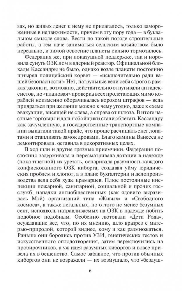 Добро пожаловать на Кассандру - новую родину киборгов, туристический рай и галактическую здравницу! Восхитительная природа, санаторный комплекс на минеральных водах, ресторан авторской кухни и увлекательные экскурсии сделают ваш визит к нам воистину незабываемым!Правда, до этих радужных перспектив еще надо как-то дожить, а пока мы можем предложить вам только широкий набор юридических ловушек и лазеек, чрезмерно инициативных киборгов, жадных кредиторов, щедрых киллеров, коварных авшуров и неупокоенных предков. Хронический недосып, снег и тараканы прилагаются в неограниченном количестве!Зато такое вы тем более никогда не забудете!