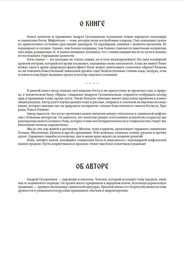 Книга писателя и художника Андрея Гусельникова посвящена народному календарю и славянским богам. Боги славян — это наследие всех индоевропейцев. Солнечные образы древних славян, мифы времён года, волшебство стихий воды, воздуха, огня и земли — всё это найдёт читатель в новой книге! Такие имена, как Велес, Перун, Лада, Макошь, Ярило, Даждьбог пронзают слух современных любителей древнеславянского наследия. При произношении имён родных богов сразу же срабатывает генетическая память. Люди хотят той романтики, с которой жили их пращуры в природе… В книге дано авторское видение богов. Автор показывает скрытый смысл в народных узорах, дошедших до наших дней, изучает тему архаичной старины, прорабатывая её в иллюстративных образах. В книге приводятся не только чёрно-белые иллюстрации, но и цветные — с графическими изображениями Велеса и Перуна, а также мифологического мирового древа. Есть в настоящем издании и новинка — календарь с приметами, а также с названиями фаз года.
