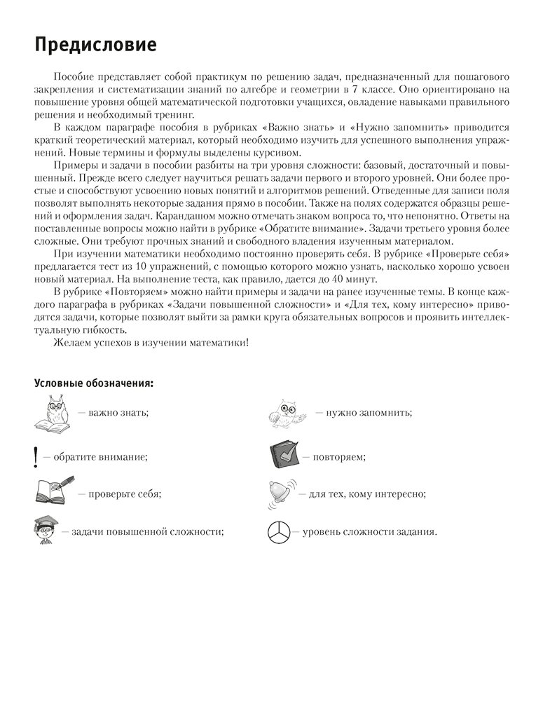 Пособие подготовлено в соответствии со школьной программой по математике и содержит задания и тесты по тем разделам алгебры и геометрии, которые изучаются в 7 классе. К каждой теме даются необходимые теоретические сведения и практические рекомендации, ко всем заданиям и тестам приводятся ответы.