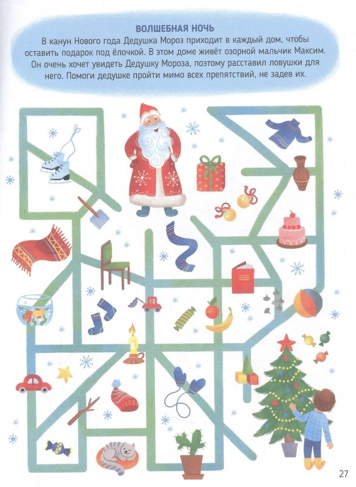 Можно ли увлечь ребенка с помощью книги, сделать досуг малыша ярче и интереснее? Конечно же, можно! Книга новогодних лабиринтов подарит малышам возможность отправиться в незабываемое путешествие по её страницам. Детвора прокатится вместе с Дедушкой Морозом на санях, слепит снеговика, поиграет в снежки, сожжёт ёлку и побывает в гостях у Снежной королевы.
