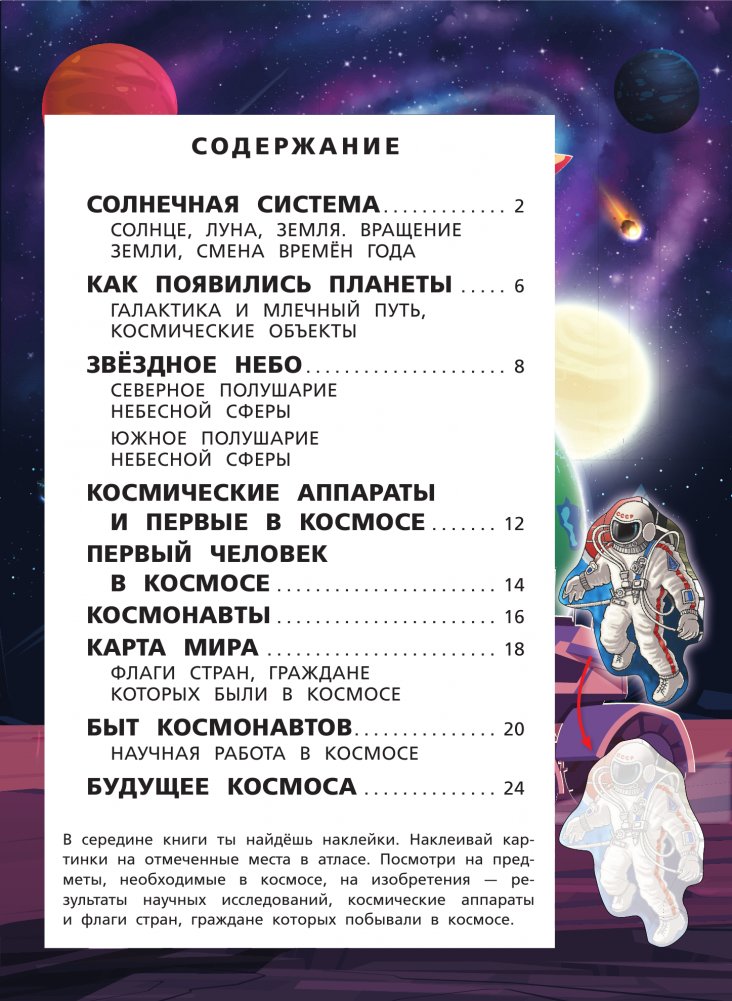 Открой атлас и соверши космическое путешествие. Планеты и созвездия Солнечной системы, космонавты и космические аппараты, научные достижения и изобретения, разработанные благодаря опытам, проводимым на космических станциях. В середине книги расположены наклейки. Находи в книге отмеченные места и соответствующие наклейки. Это поможет запомнить сложную, но интересную информацию. Размещенная в атласе информация будет интересна и для девочки, и для мальчика. Игровые занятия с нашим атласом расширяют кругозор и словарный запас, тренируют память, внимание, наблюдательность, смекалку и творческие способности.