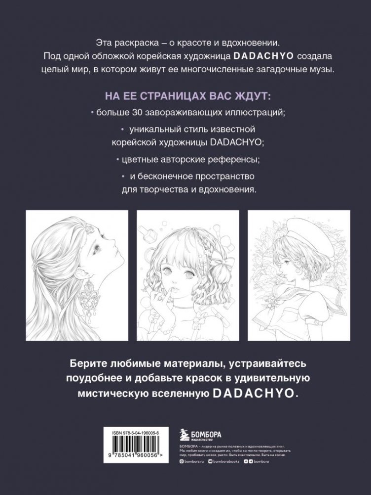 Эта раскраска - о красоте и вдохновении. Под одной обложкой корейская художница DADACHYO собрала больше 30 иллюстраций, на которых изображены ее многочисленные музы. Вместе с этой антистресс-раскраской вы погрузитесь в волшебный мир прекрасных девушек и сможете проявить весь свой творческий потенциал. Берите любимые материалы, устраивайтесь поудобнее и добавьте красок в удивительную вселенную DADACHYO.