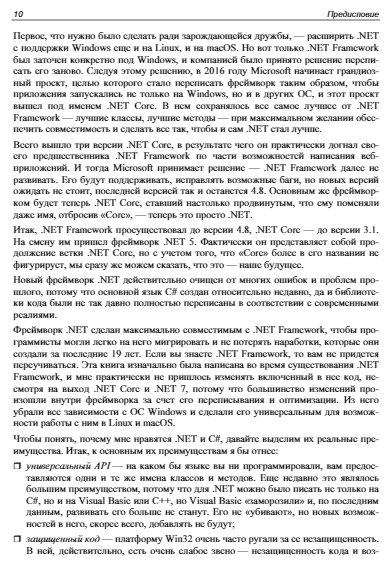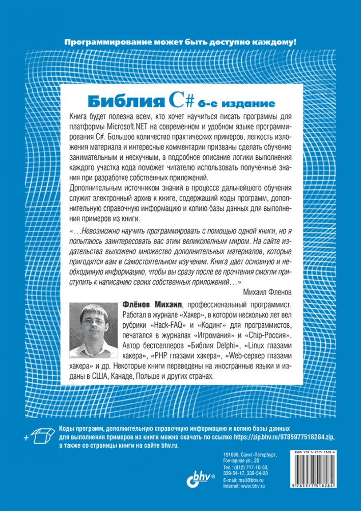 Книга посвящена программированию на языке C# для платформы Microsoft .NET, начиная с основ языка и разработки программ для работы в режиме командной строки и заканчивая созданием современных веб-приложений. Материал сопровождается большим количеством практических примеров. Подробно описывается логика выполнения каждого участка программы. Уделено внимание вопросам повторного использования кода. В 6-м издании примеры переписаны с учетом современной платформы .NET 7, большой упор сделан на веб–приложения и фреймворк доступа к данным Entity Framework. На сайте издательства находятся коды программ, дополнительная справочная информация и копия базы данных для выполнения примеров из книги.