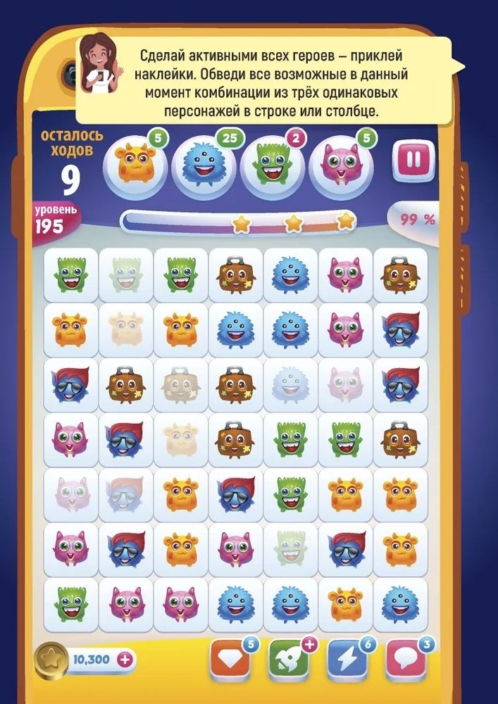 В блокноте более 30 развивающих игр для детей: шифры, коды, раскраски, картинки с отличиями, головоломки, турнир геймеров и другие задания для развития смекалки, речи и воображения, а также 70 ярких наклеек.