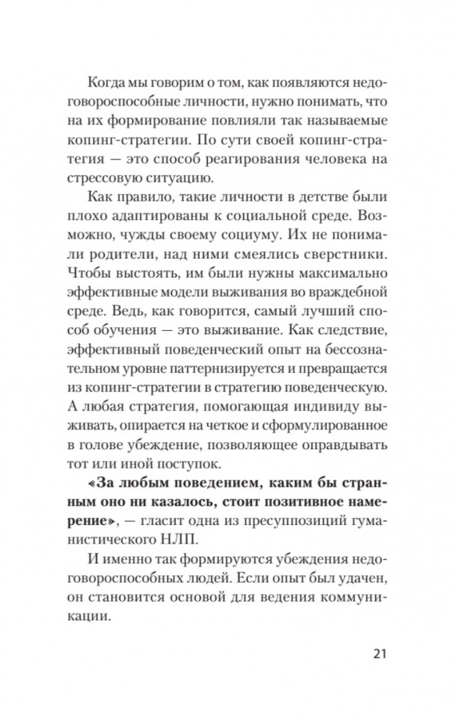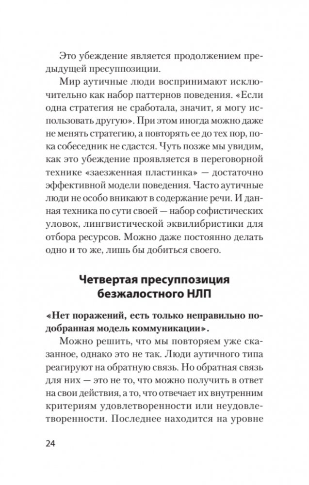 Вы узнаете, что такое безжалостное НЛП, как оно возникло и чем отличается от фундаментального боевого НЛП. Авторы описывают контексты применения безжалостного НЛП, его эффективность и примеры воздействия на окружающих. Также вы научитесь моделированию недоговороспособных переговорщиков и успешному использованию их принципов. В книге представлен психологический профиль шизоидов и агрессивных аутистов, дано объяснение, почему они успешны в своем безумстве и чем нам это грозит. Проведен анализ известных личностей: Чикатило, Гарольд Шипман, Рон Хаббард, Родион Раскольников, школьные стрелки, – что у них общего?