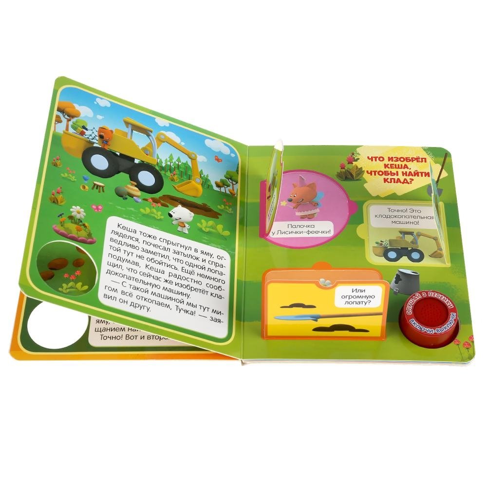 Музыкальная книга с окошками «Ми-ми-мишки. Клад» ТМ «УМка» - отличный подарок для вашего малыша: - 1 звуковая кнопка - 3 песенки - интересный сюжет по мотивам мультсериала - подвижные элементы (секретные окошки) - красочные иллюстрации Ребёнок с удовольствием будет листать плотные страницы, рассматривать яркие картинки, открывать окошки и смотреть, кто там спрятался. Вместе с родителями он прочитает про приключения любимых персонажей, а также самостоятельно сможет понажимать на звуковую кнопку и послушать весёлые песенки. Малыш легко освоит включение звука: по нажатию на кнопку включится первая песенка, при втором нажатии выключится, в 3-ий раз - заиграет следующая песенка и т.д. Благодаря компактному формату книгу удобно взять с собой в дорогу. Музыкальная книга ТМ «УМка» развивает: - слуховое восприятие и музыкальный слух - навык чтения - фантазию - образное мышление - память Объём: 8 стр. Формат: 152 х 185 мм. Материал: пластмасса + картон. Работает от 3-х батареек типа LR1130 (в комплекте). Рекомендовано детям от 6 мес.