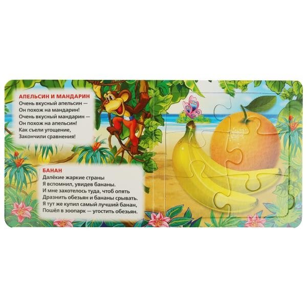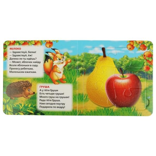 Данная книга выполняет сразу 2 функции: это и книга для чтения, и игра в пазлы. На каждом развороте малыша ждёт интересный стих Марины Дружининой, а также яркий пазл с изображением фруктов, ягод или овощей. Книжка изготовлена из плотного картона, поэтому мамы могут не опасаться, что ребёнок порвёт странички. Благодаря удобному формату книгу можно взять с собой в дорогу.