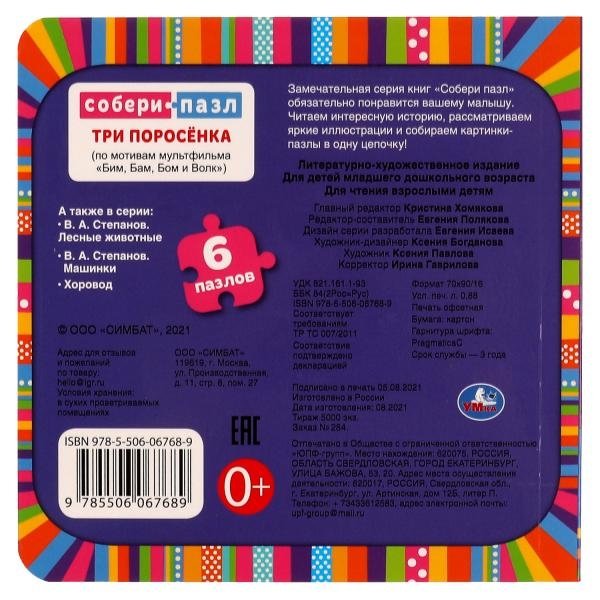 Маленький любознайка будет рад услышать увлекательную и поучительную историю о трёх братьях-поросятах. Кроме того, он с удовольствием будет играть с яркими пазлами, доставая их из специальных пазов-углублений и вставляя обратно. Все представленные в книге пазлы можно соединить в одну длинную цепочку. Книжка изготовлена из плотного картона, поэтому мамы могут не опасаться, что ребёнок порвёт странички. Благодаря удобному формату книгу можно взять с собой в дорогу.