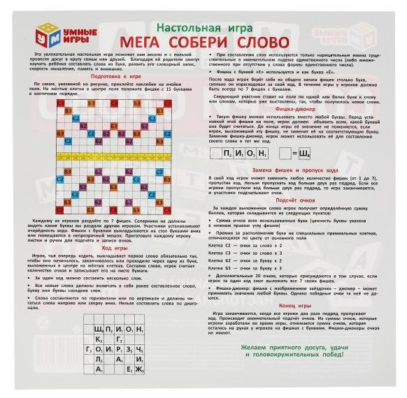 Цель игры: составить на игровом поле как можно больше слов из имеющихся фишек. С этой весёлой настольной игрой ребёнку предстоит погрузиться в увлекательный процесс составления слов. Игра будет очень творческой, и вместе с тем потребует от участников продемонстрировать логические навыки и стратегическое мышление. Именно поэтому она подходит для игроков любого возраста и быстро увлечёт и взрослых, и детей. Благодаря компактным размерам игру удобно брать с собой.