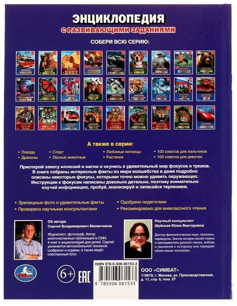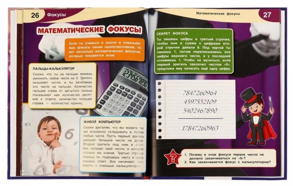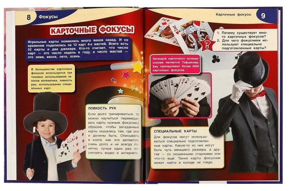 Эта занимательная энциклопедия расскажет юному читателю об известных фокусниках и откроет тайны разных фокусов. Зрелищные фото и удивительные факты увлекут ребёнка и помогут ему быстро, эффективно и с удовольствием усвоить новую информацию.