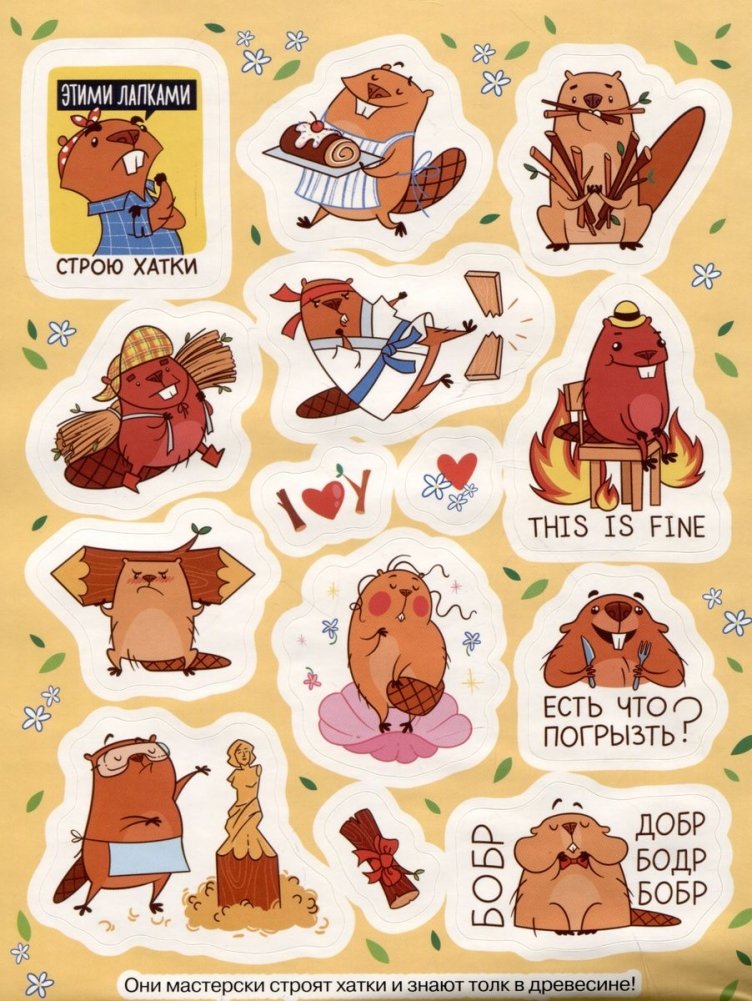 Альбом из 100 наклеек с забавными бобрами и весёлыми надписями. Смешные изображения и высказывания зацепят внимание и поднимут настроение не только детям, то и подросткам.