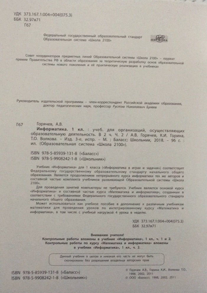 На уроках информатики в 1-м классе дети учатся: - находить лишний предмет в группе однородных; - давать название группе однородных предметов; - находить предметы с одинаковым значением признака; - находить закономерности по одному признаку; - называть последовательность знакомых действий; - находить пропущенное действие; - отличать заведомо ложные фразы; - называть противоположные по смыслу слова. Комплект «Информатика в играх и задачах», состоящий из учебников, контрольного материала и подробных поурочных разработок, предназначен для проведения уроков по информатике в классах начальной школы. Учебная нагрузка – один урок в неделю. Одна из основных целей курса – развитие логического мышления. Для проведения занятий компьютеры не требуются. Методические рекомендации с подробными поурочными разработками позволяют вести данный курс учителям начальных классов без специальной подготовки.