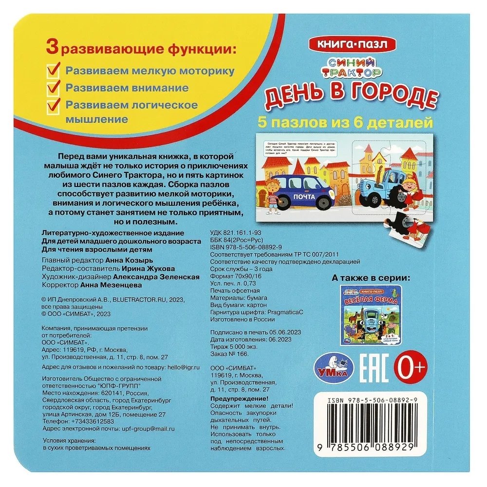 Перед вами уникальная книжка, в которой малыша ждёт не только история о приключениях любимого Синего Трактора, но и пять картинок из шести пазлов каждая. Сборка пазлов способствует развитию мелкой моторики, внимания и логического мышления ребёнка, а потому станет занятием не только приятным, но и полезным.