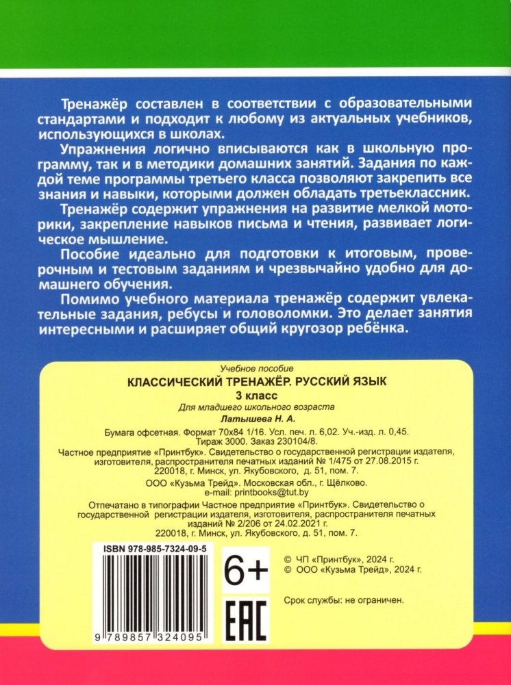 Тренажёр содержит упражнения на развитие мелкой моторики, закрепление навыков письма и чтения, развивает логическое мышление.