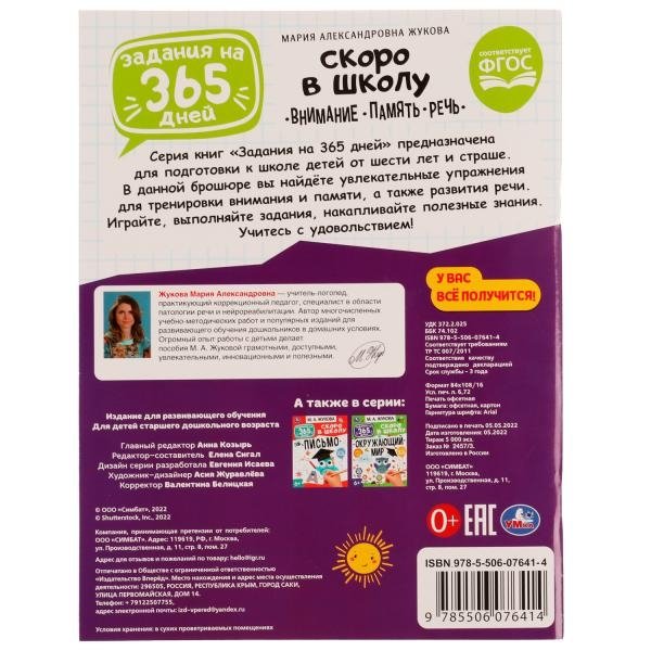 Брошюра «М. А. Жукова. Скоро в школу. Внимание, память, речь» из серии «Задания на 365 дней» ТМ «УМка» непременно понравится маленьким любознайкам: