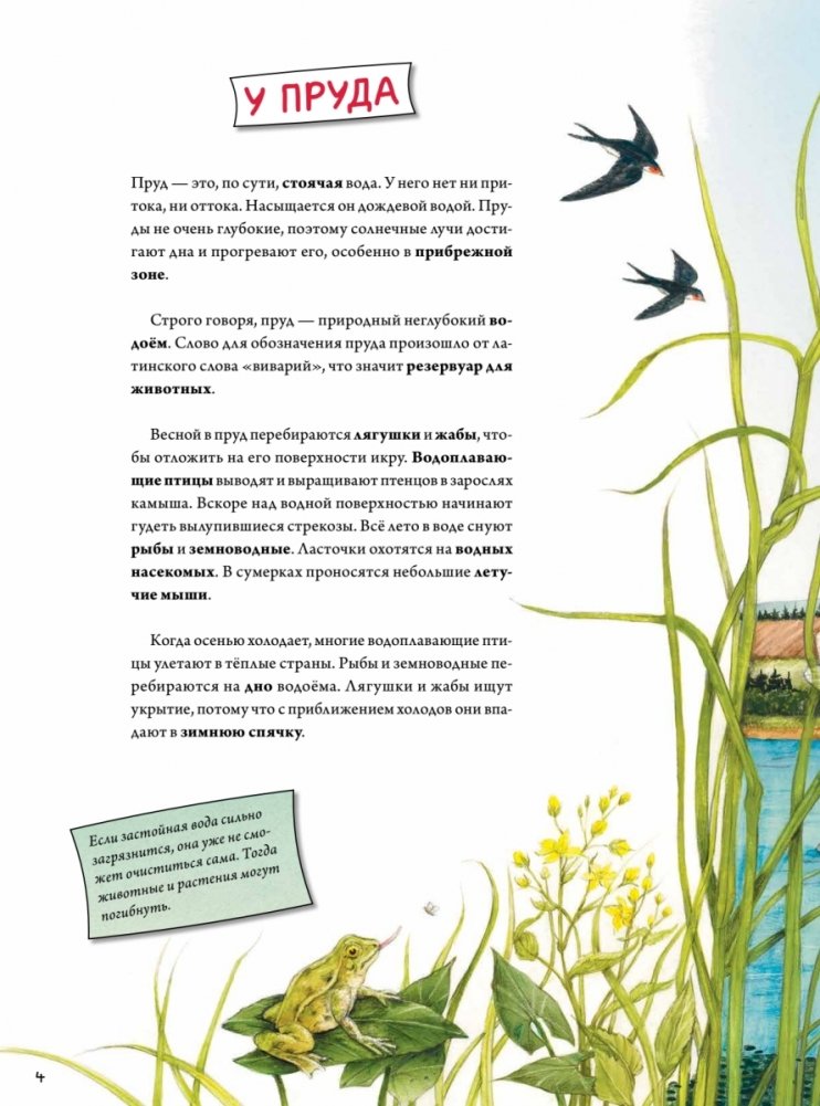 Ты замечал, что на берегах рек, озёр, прудов или даже в толще воды вовсю кипит жизнь? В прибрежной зоне растут разнообразные травы и цветы, по водной глади бегают насекомые и плавают птицы, а в камышах прячутся лягушки. Наблюдать за ними очень интересно и познавательно! Из этой книги ты узнаешь о цаплях, зябликах, ракушках, рыбах, водорослях и многих-многих других обитателях водоёмов. А запомнить, как они выглядят, помогут нежные и подробные акварельные иллюстрации автора.