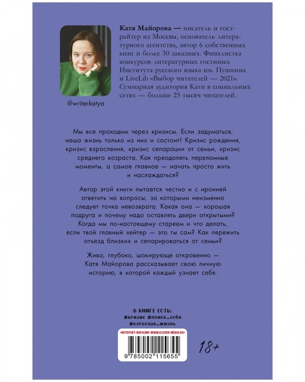 Мы все проходим через кризисы. Если задуматься, наша жизнь только из них и состоит! Кризис рождения, кризис взросления, кризис сепарации от семьи, кризис среднего возраста.Как преодолеть переломные моменты, а самое главное - начать просто жить и наслаждаться? Автор этой книги пытается честно и с иронией ответить на вопросы, за которыми неизменно следует точка невозврата. Какая она - хорошая подруга и почему надо оставлять двери открытыми? Когда мы по-настоящему стареем и что делать, если твой главный хейтер - это ты сам? Как пережить отъезд близких и сепарироваться от семьи?