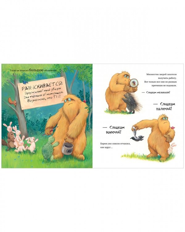 На этот раз мы познакомимся с мохнатым чудищем по имени Барни. Не переживайте, он совсем не страшный, а как раз наоборот — невероятно милый, обаятельный и даже обнимательный! Все звери леса так и норовят заключить его в свои объятия. Конечно, Барни это тоже любит, но… довольно неудобно, когда тебя обнимают, гладят, чешут и щекочут целый день напролет. Что придумает Барни?