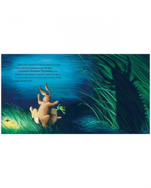 Одной темной-темной ночью Лягушонок возвращался домой в свой пруд после долгой зимы. Ветер жутко завывал, когда он увидел, что кто-то страшный притаился в зарослях. Наверное, это Водяное Чудище! Лягушонок обратился за помощью к своим друзьям, но с каждым разом Чудище становилось все страшнее и страшнее... пока... пока они не поняли, что все это время всего лишь боялись собственной тени. Правильно говорят: «У страха глаза велики!»