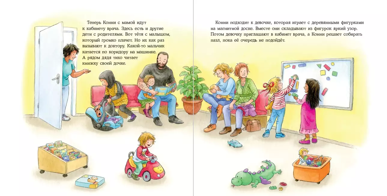 Вместе с Конни подготовьте ребенка к предстоящему мероприятию: прочитайте, как проходит осмотр у врача, что он проверяет и какие инструменты использует. Если все обсудить с малышом заранее, он наверняка не будет нервничать и пугаться в поликлинике и ежегодный осмотр пройдет спокойно.