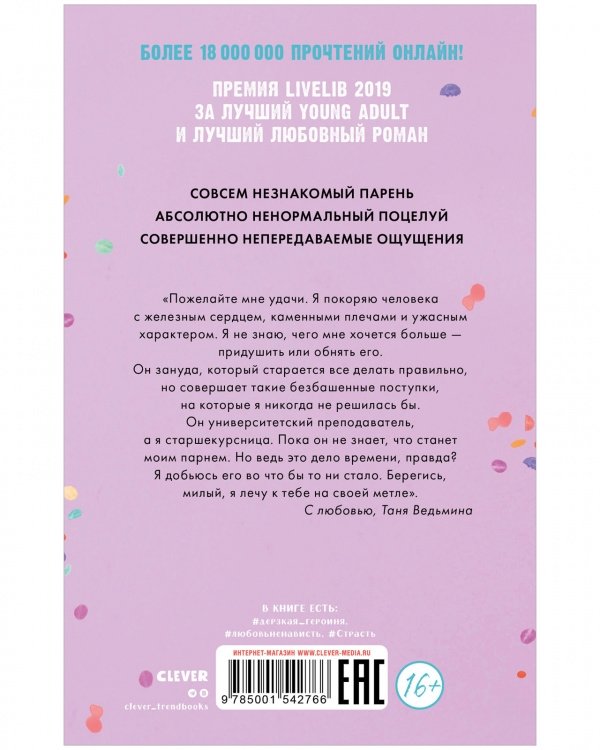 Соскучились? Студентка Таня Ведьмина может влюбить в себя абсолютно любого мужчину. Даже если он – ее преподаватель в университете. Она покорила сердце Олега Владыко несмотря на его яростное сопротивление. Он притворился ее парнем и сам не заметил как влюбился! У него самые нежные губы и самые ласковые руки…а еще ужасный характер. Таню тянет к нему, но что-то не дает им быть вместе: гордость, чужая зависть, ложь, месть…Опасность грозит не просто их отношениям, но жизни Олега. И Таня должна спасти свою любовь. Любой ценой. Влюбленная ведьма способна на все – так гласит закон Тани Ведьминой.